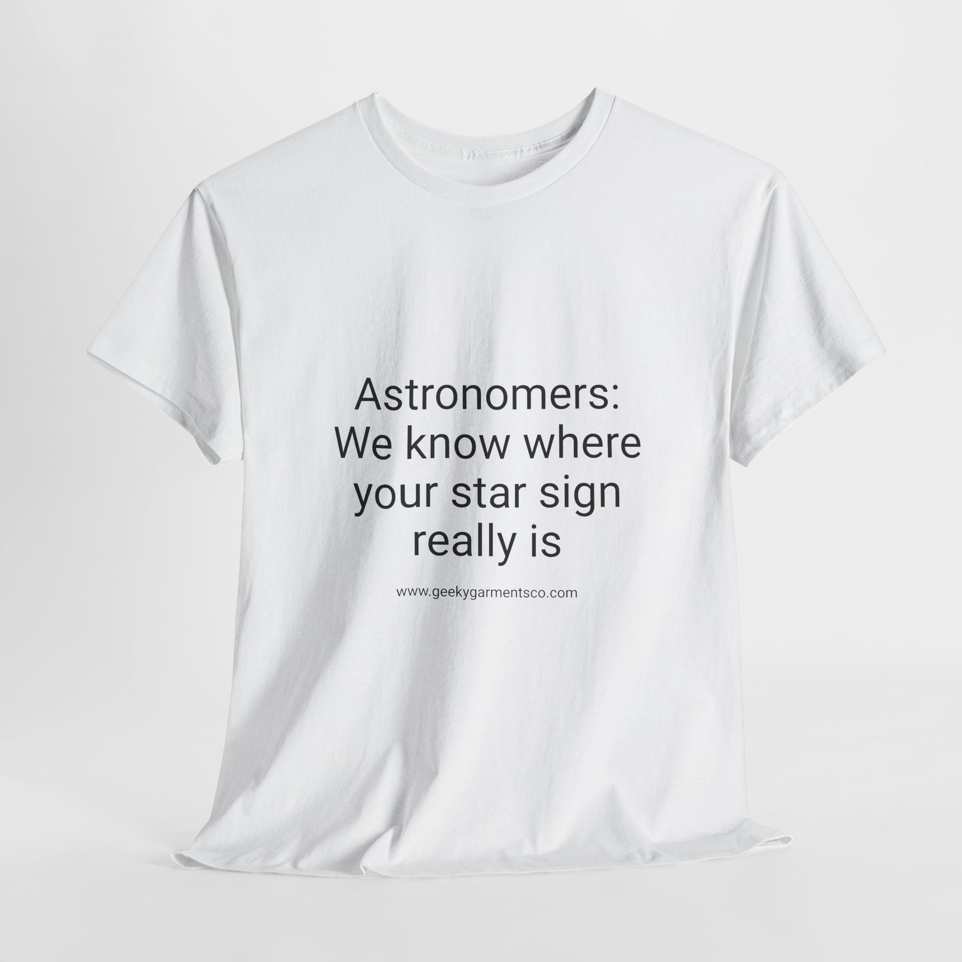 Elevate Your Geek Chic with Geeky Garments Co. in the Unisex Heavy Cotton Tee - "Astronomers: We know where your star sign really is".