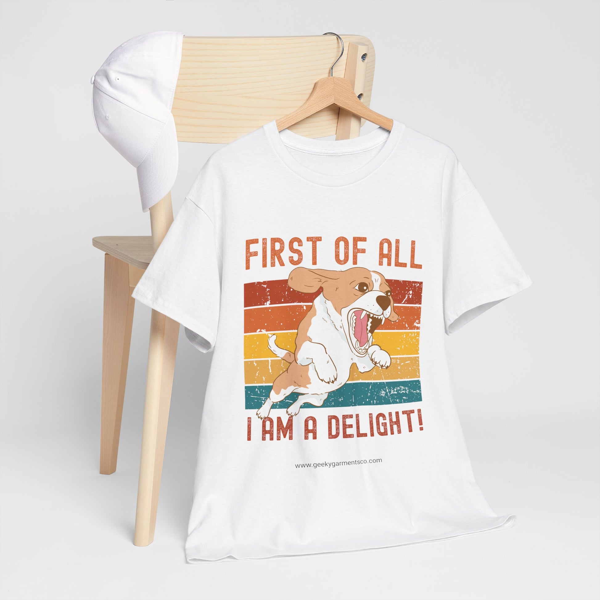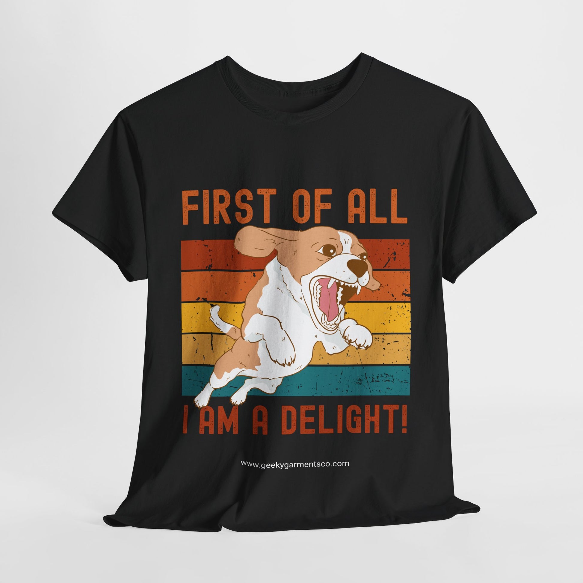 Express your unique personality with this 'First of all I am a delight!' tee featuring an angry dog (corgi style) on a retro sunset background. The comfortable fabric and classic fit make it perfect for everyday wear, adding a fun and quirky vibe to your wardrobe. Ideal for dog lovers and those who enjoy bold graphic tees. Perfect for casual outings, lounging at home, or as a statement piece for social gatherings. Great for birthdays, holidays, or cat-themed events.