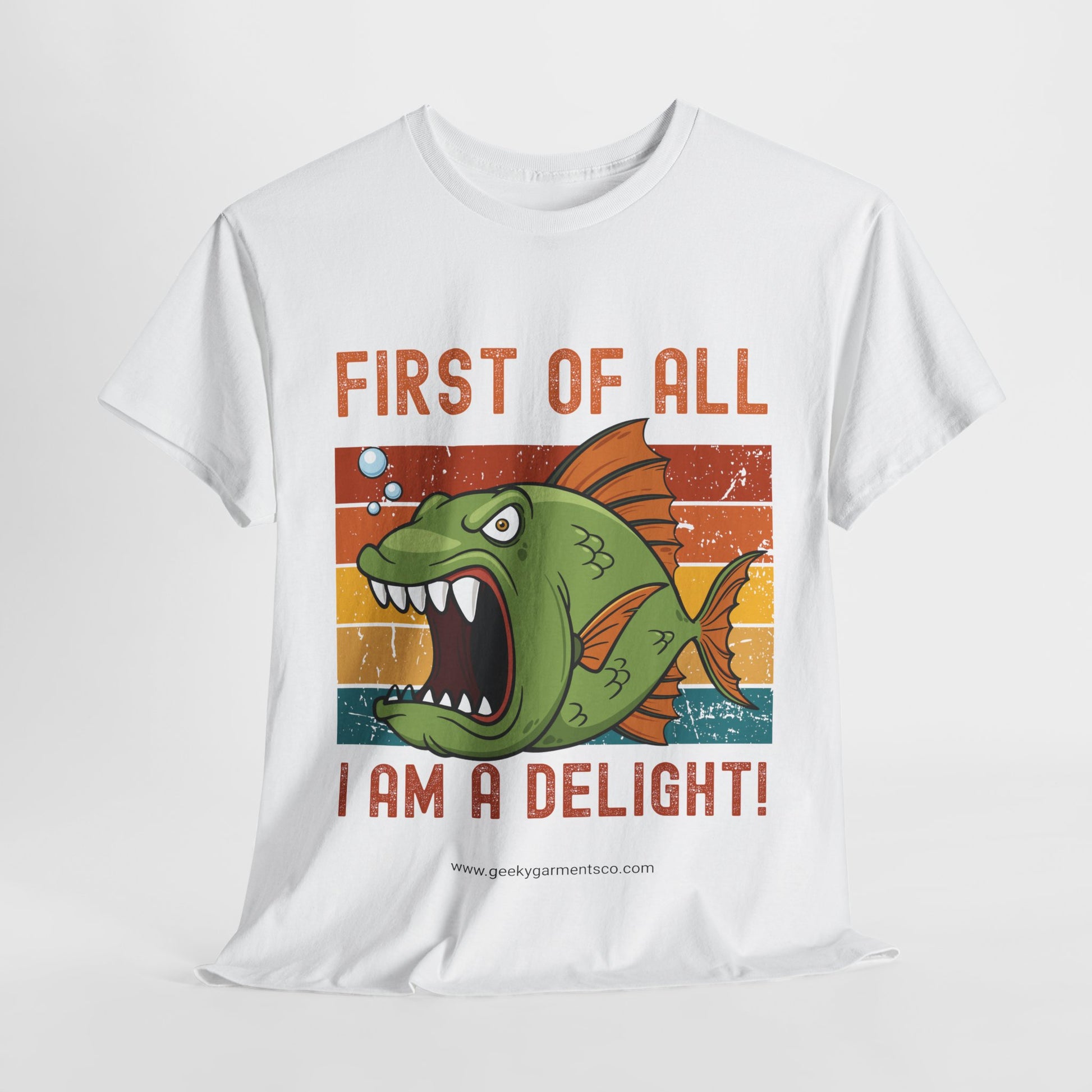 "First of all I am a delight!" angry fish on retro sunset tshirt