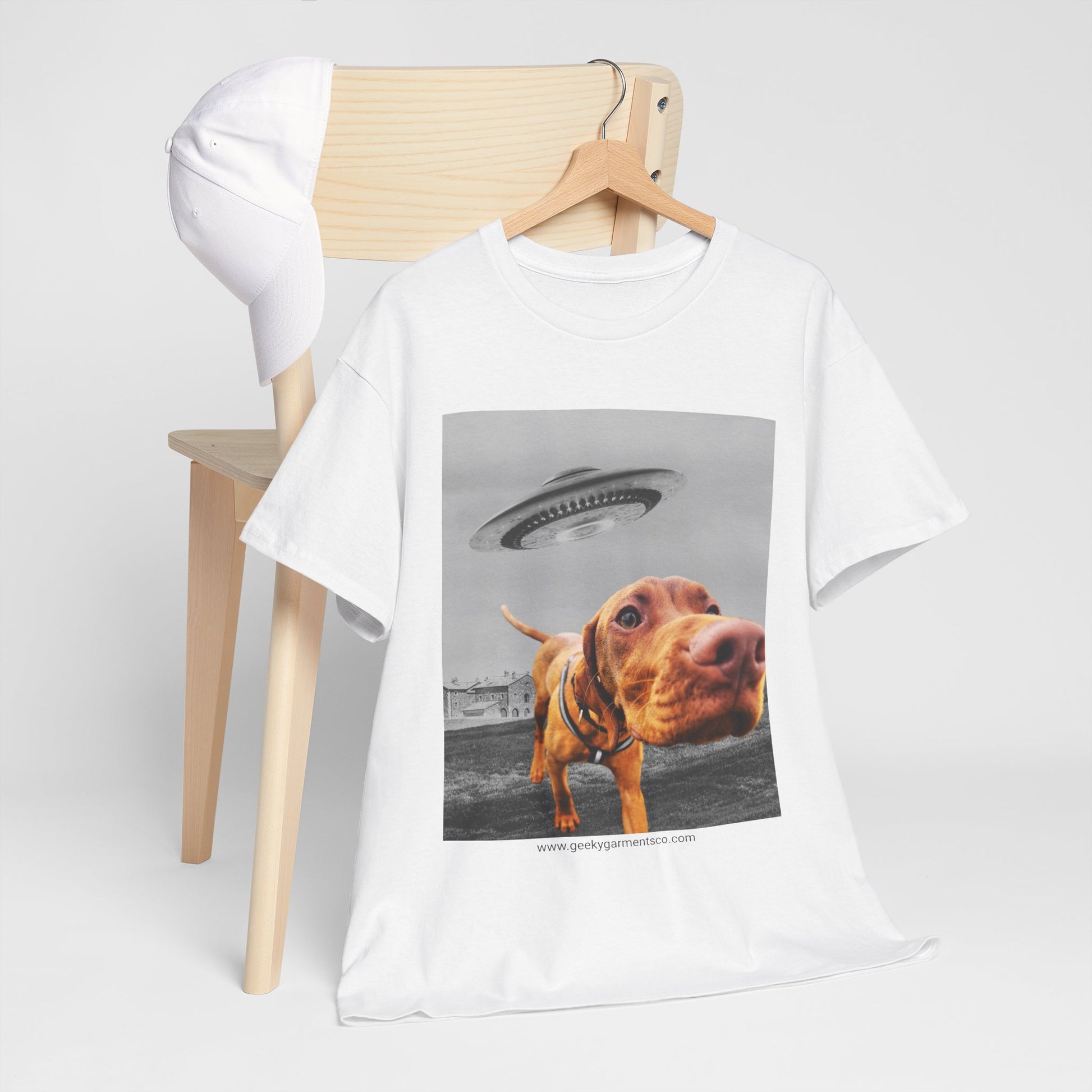 A playful and whimsical T-shirt featuring a Viszla puppy being chased by a UFO design. Perfect for dog lovers and those who enjoy a touch of humor in their wardrobe. Ideal for casual wear or as a conversation starter at parties and gatherings. Great for dog-themed holidays or UFO enthusiasts.